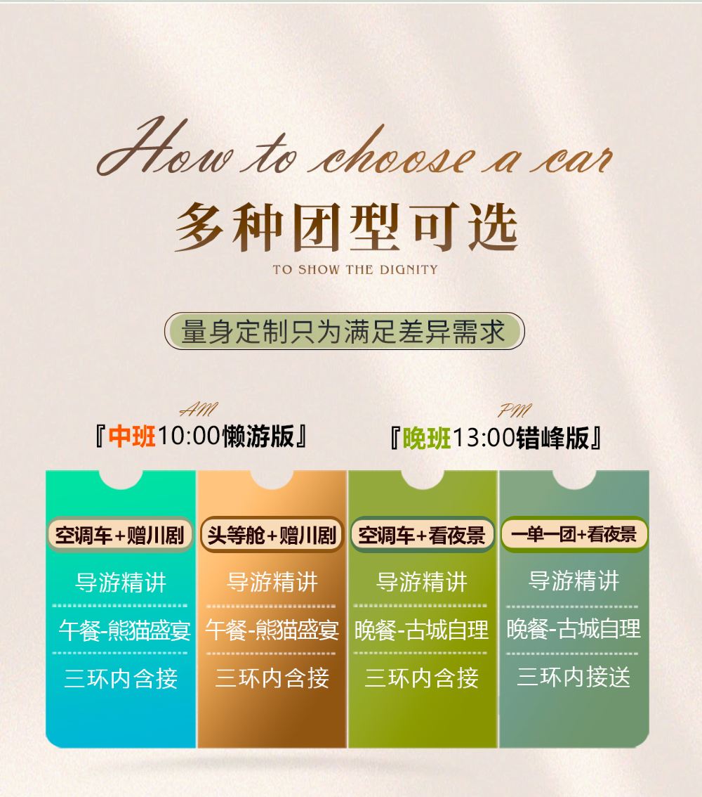 17:10 返程散团:乘车返回,成都市青羊区琴台路(旺季约19点左右回到成都市区琴台路散团)