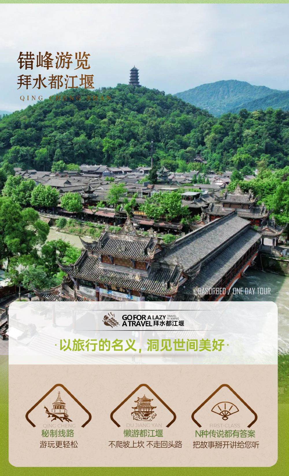 【2-8人小团】游览线路为:秦堰楼—二王庙—夫妻桥—鱼嘴—飞沙堰—宝瓶口—伏龙观—堰工道—离堆公园—南桥